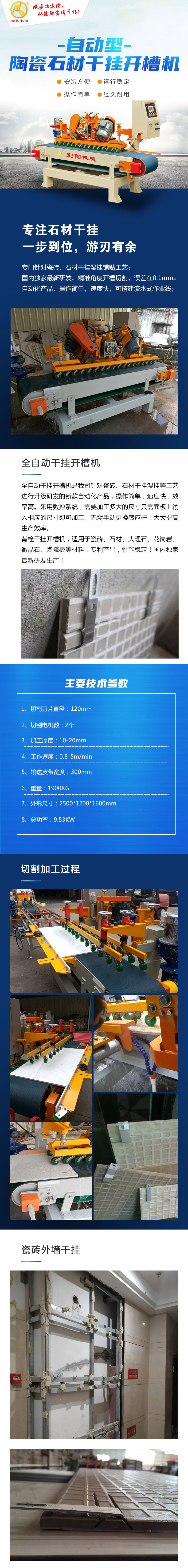 BT-1200型全自動瓷磚干掛開槽機是我司針對瓷磚、石材干掛濕掛等工藝進行升級研發的新進自動化產品,操作簡單,速度快,效率高。采用數控系統,需要加工多大的尺寸只需面板上輸入相應的尺寸即可加工。無需手動更換感應桿,大大提高生產效率。