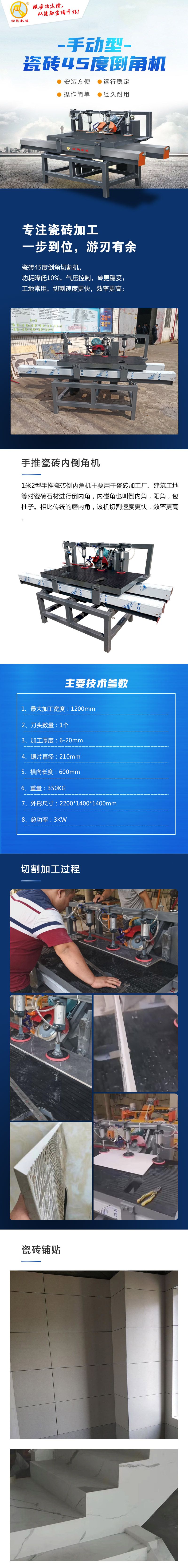 1200型手動45度倒角機主要是用來把瓷磚的邊倒45度角,方便V型上墻,裝飾更加美觀,適用在瓷磚加工廠、建筑工地等對瓷磚石材等材料倒角,內碰角也叫倒內角,陽角,包柱子。相比傳統的磨內角,該機切割速度更快,工作效率更高。