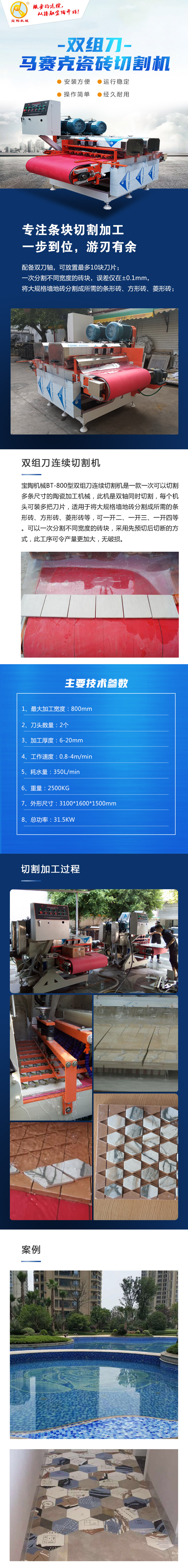 BT-800型雙組刀自動切割機適用于用拋光磚分割成各種規格的高檔馬賽克,尺寸最小可分割10mm×10mm及各種形狀,如菱形、六角型等,分割中可同時進行倒面角,完全不需要人手再加工,本機具有機械性能穩定,在分割小形馬賽克時,可壓穩磚塊,確保分割開的小形磚塊不會飛出及效率高,質量好等特點。