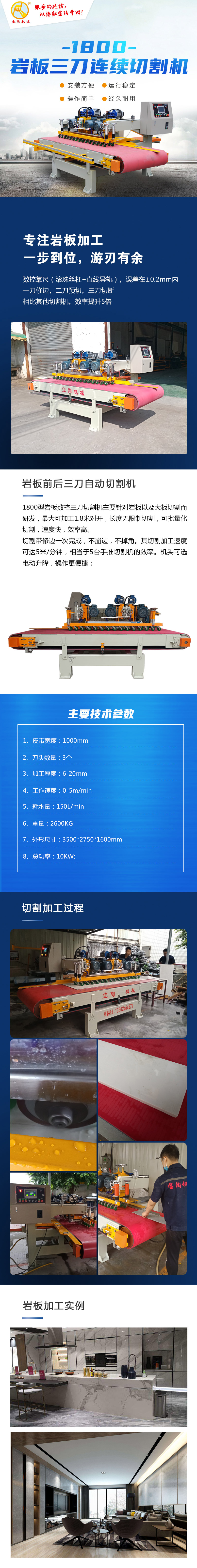 1800型全自動前后3刀數控大板切割機是一款專門針對陶瓷大板切割的新型機械,具有切割速度快,加工效果好,能連續切割,穩定性好,是整個陶瓷加工行業唯一能連續不斷加工的大板自動切割機,有輸送帶流水線式自動批量切割,效率是手推大板切割機的4倍。