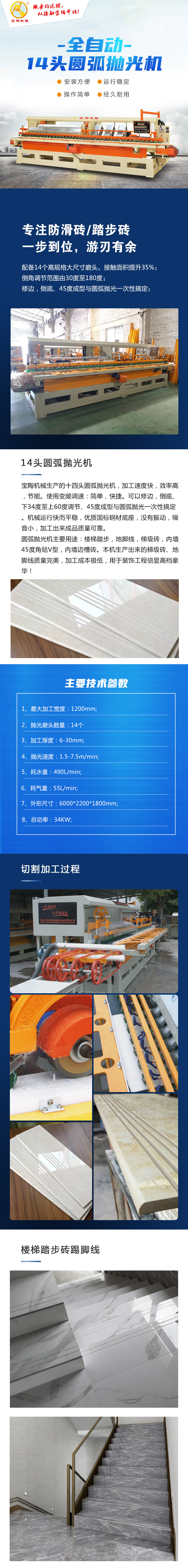 拋光磨頭可手動、自動控制,變頻調速,氣動壓輪,采用進口軸承,進口品牌電器元件,不銹鋼螺絲。由于機械功能齊全,操作方便,專業加工拋光樓梯踏步、地腳線、45度斜邊等。運行平穩、振動小、噪音低、加工速度快、加工成本極低,整機設計美觀大方,受到廣大客戶一致好評!