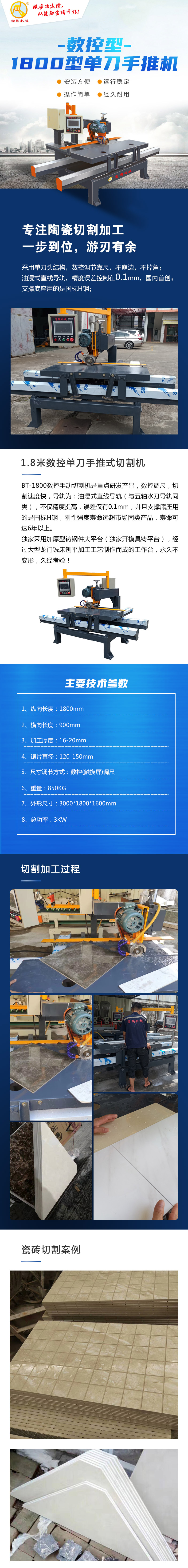 BT-1800型單刀數控手動瓷磚切割機是數控型瓷磚切割機,帶有數控操作系統,解決了切割尺寸多樣,復雜多變,加工麻煩的難題,采用數字控制調節靠尺,加工精度高,切割無大小頭,切割效果好等特點,不分生熟手均可操作。可以給客戶降低人工成本費用,節約了切割時間,機器穩定性超強,切割精準度高,操作系統簡單,任何一個人都可以隨意操作。